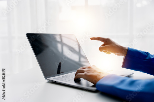 Sticker : Close-up portrait typing keyboard on laptop computer - working online on white table at office - faceb
