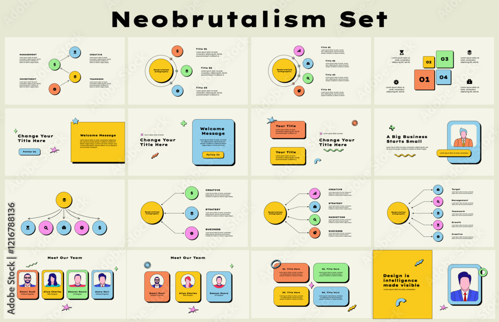Collection of infographic presentation slides with team slides, flowchart and other diagrams - busineSticker