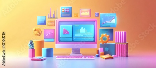 The watermark will not be included on Sticker.: Colorful computer with a variety of icons and data visualizations -
