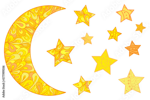 Sticker colorful crescent moon with stars on white. moon and stars with abstract patterns on isolated backgr