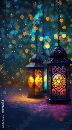 Sticker : Colorful lanterns glowing with warm light against a mystical background of bokeh and sparkles in a n