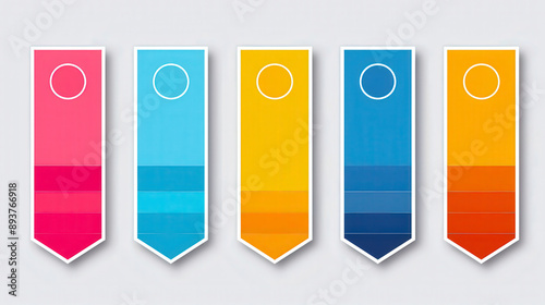 Sticker colorful vertical banners in a row with gradient patterns and circular icons at the top, ideal for i