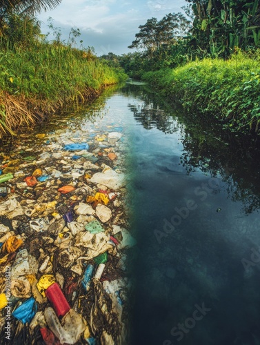 The watermark will not be included on Sticker.: Comparison of polluted river littered with trash and a pristine stream reflecting environmental disp
