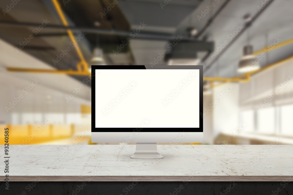 The watermark will not be included on Sticker.: Computer monitor on the desk office interior in the background display mock up