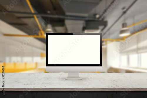 Sticker computer monitor on the desk office interior in the background display mock up