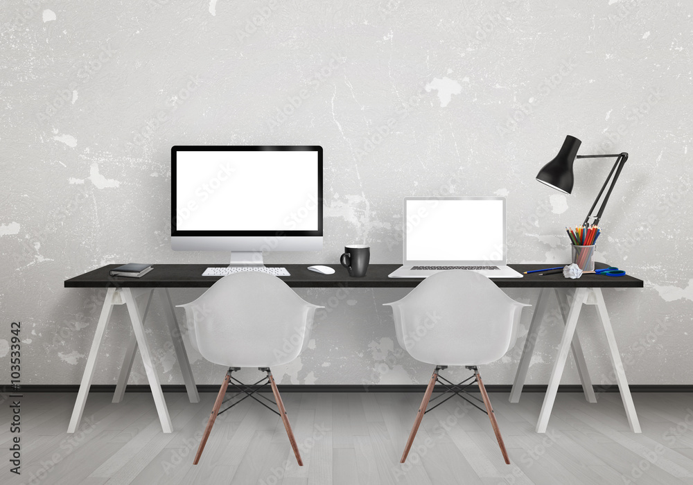 Sticker : Computers on the desk in the office - workplace with pc and laptop isolated displays for mock up - cha