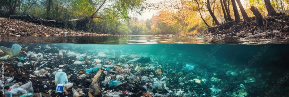 The watermark will not be included on Sticker.: Contrast between polluted river filled with trash and pristine stream showcasing environmental degra