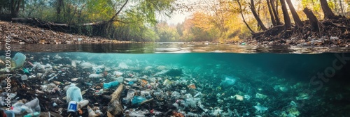 Sticker contrast between polluted river filled with trash and pristine stream showcasing environmental degra - Stickers Sticker contrast between polluted river filled with trash and pristine stream showcasing environmental degra - Stickers