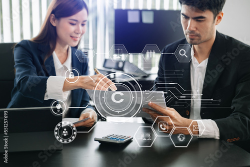 Copyright or patent concept, business team analyzing data and using smart phone and tablet with virtSticker