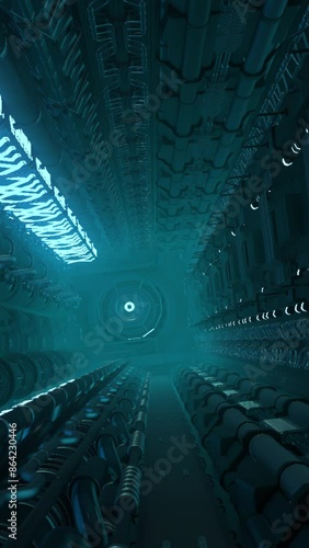 Corridor with pipes and lines in futuristic ship - motion - tunnel with neon lines and technological pSticker