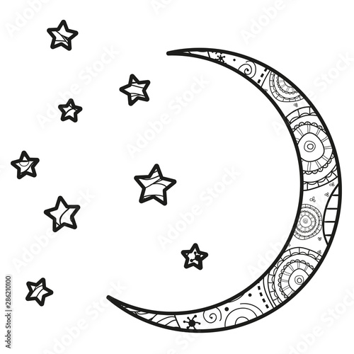 Sticker : Crescent moon with stars with abstract patterns on isolation background - design for spiritual relaxa
