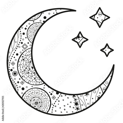 The watermark will not be included on Sticker.: Crescent moon with stars with abstract patterns on isolation background - design for spiritual relaxa