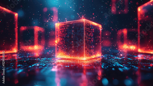 The watermark will not be included on Sticker.: Cube of digital data in futuristic cyberspace, glowing block with neon cyber energy like tech innova