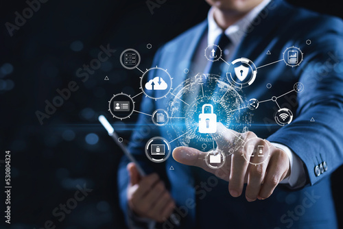 The watermark will not be included on Sticker.: Cybersecurity and privacy concepts to protect data - lock icon and internet network security technolo