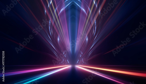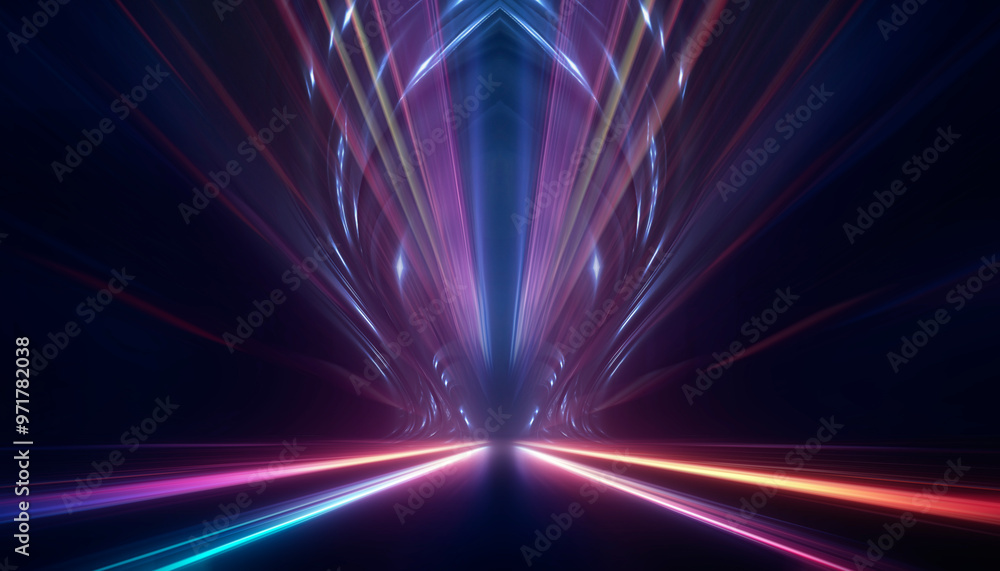 The watermark will not be included on Sticker.: Dark abstract background - empty neon stage with rays -