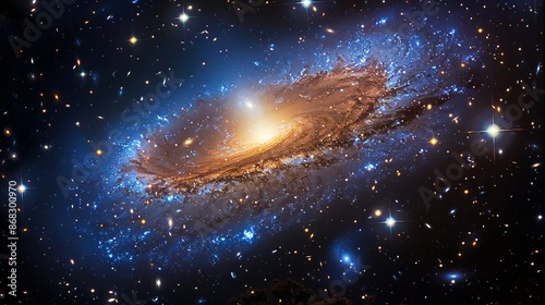 Sticker : Deep space image featuring a spiral galaxy with a glowing core and extensive star fields generative