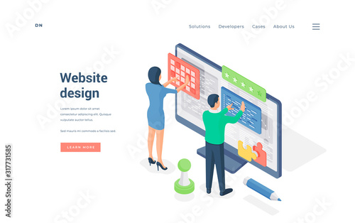 Sticker : Designers working on website ui - isometric vector illustration