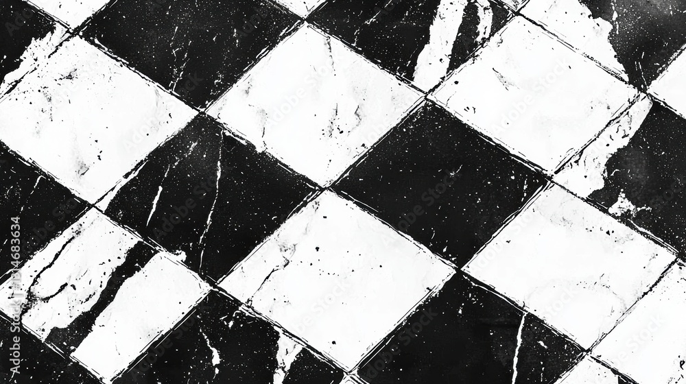 The watermark will not be included on Sticker.: Detailed black and white checkerboard tile pattern sketch featuring smooth marble texture in a flat
