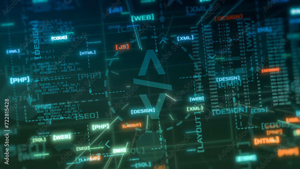 Sticker : Diagram illustration, web design and development concept, abstract grid with symbols and technical t