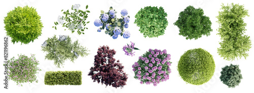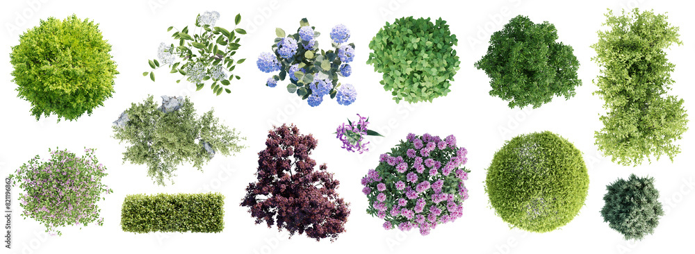 The watermark will not be included on Sticker.: Different types of garden plants isolated on transparent background - top view - 3d render -