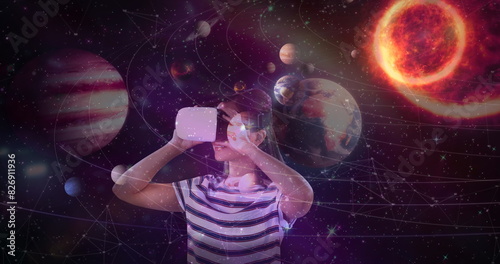 Digital composite of science composition woman watching the universe with augmented realitySticker