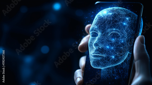 The watermark will not be included on Sticker.: Digital face on smartphone: a hand holds a smartphone displaying a futuristic, digitally rendered fa