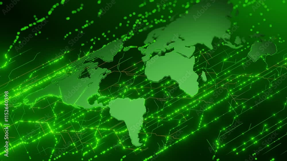 The watermark will not be included on Sticker.: Digital world map with glowing green network connections on a dark background - futuristic technology