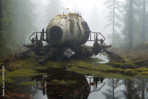 Dilapidated spacecraft in a foggy swamp, created with generative aiSticker
