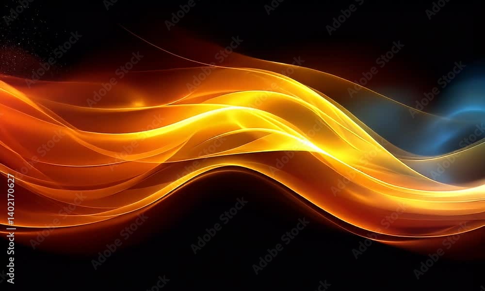 The watermark will not be included on Sticker.: Dynamic abstract waves of colorful light in orange and gold flowing smoothly against a dark backgrou