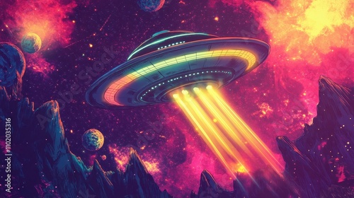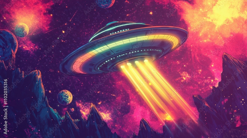 Sticker : Dynamic ufo glowing with vibrant lasers in a cosmic starry background