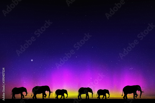 Sticker elephant family at starry night. animal silhouettes. aurora borealis