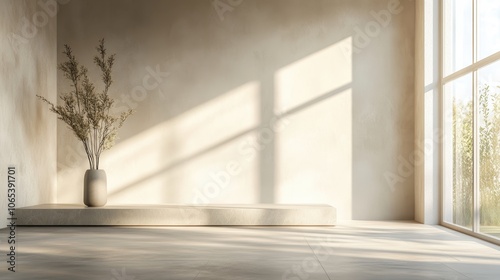The watermark will not be included on Sticker.: Empty room with sunlight casting shadows and vase on a shelf