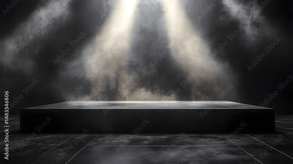 The watermark will not be included on Sticker.: Empty studio table with dramatic lighting for product display