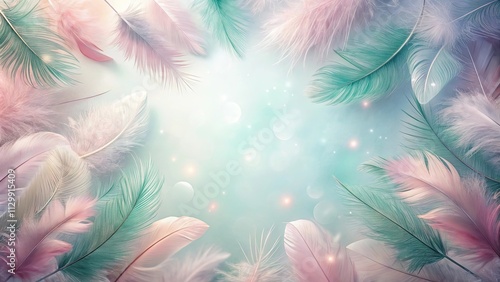 The watermark will not be included on Sticker.: Ethereal pastel feathers float on a soft, dreamy background, creating a delicate and serene scene -