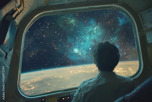 Exploring vast star fields while gazing from a spacecraft's window above earth, traveling through stSticker