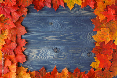 The watermark will not be included on Sticker.: Fall background frame with maple leaves on blue
