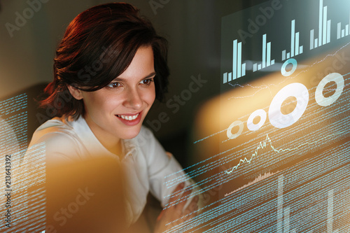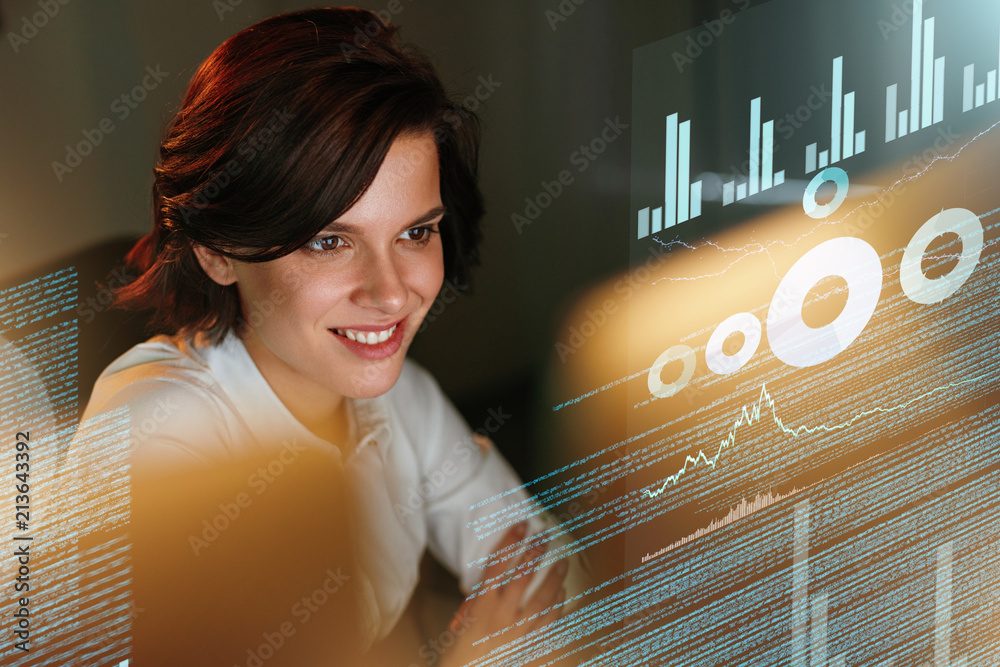 The watermark will not be included on Sticker.: Female programmer working with hologram display