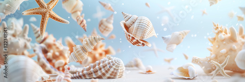 The watermark will not be included on Sticker.: Floating sea shells and starfish with bubble on blue background banner - panoramic web header - wide s