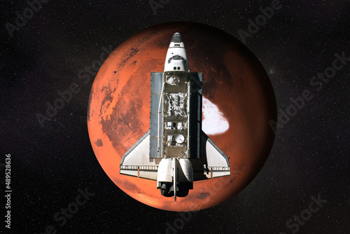 Sticker flying space shuttle close to the mars planet of solar system. north pole of the mars planet in the