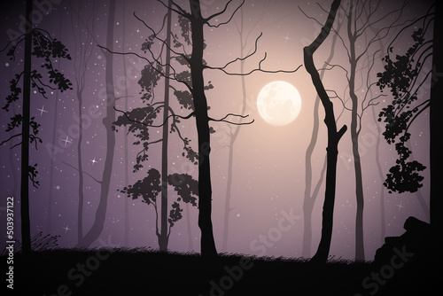 Sticker : Forest on moonlight night - bare tree silhouettes - full moon and stars