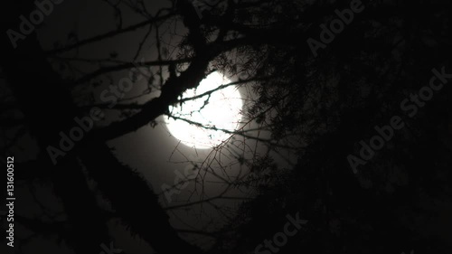 The watermark will not be included on Sticker.: Full moon rising through tree branches at night, close up in real time -
