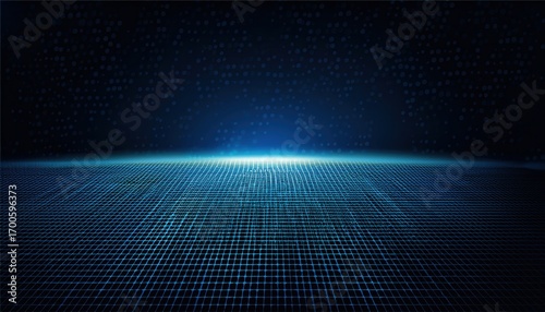 Sticker : Futuristic blue digital grid illuminated by glowing light at horizon creating a sci-fi abstract envi