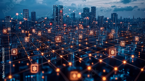 The watermark will not be included on Sticker.: Futuristic city skyline with blockchain technology visualized through interconnected nodes and finan