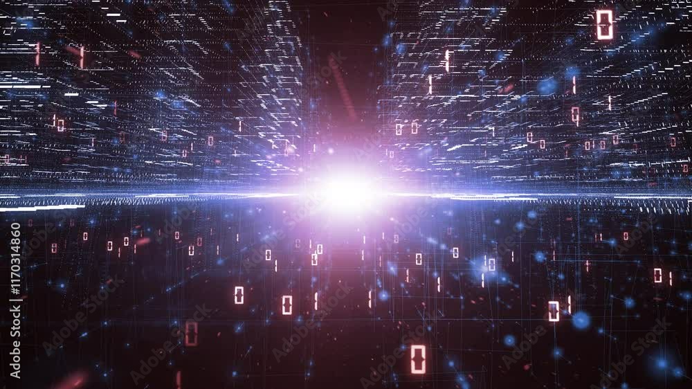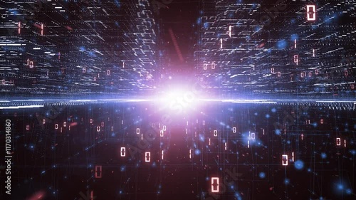 The watermark will not be included on Sticker.: Futuristic digital computer data network with artistic city buildings loop motion background -