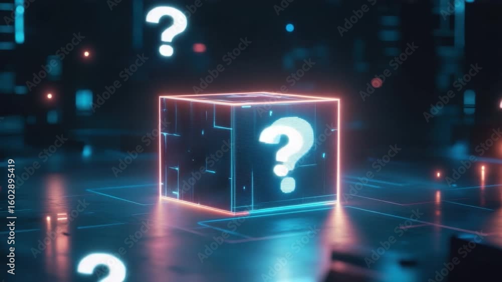 Sticker : Futuristic digital cube with glowing question marks in a virtual environment 4k video footage