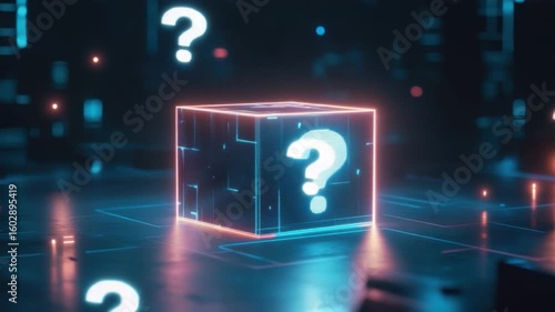 The watermark will not be included on Sticker.: Futuristic digital cube with glowing question marks in a virtual environment 4k video footage