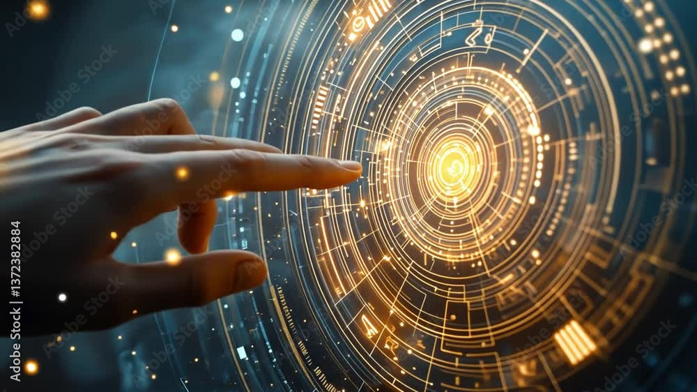 Futuristic hand interacting with glowing digital interface and advanced technology in a sci-fi envirSticker