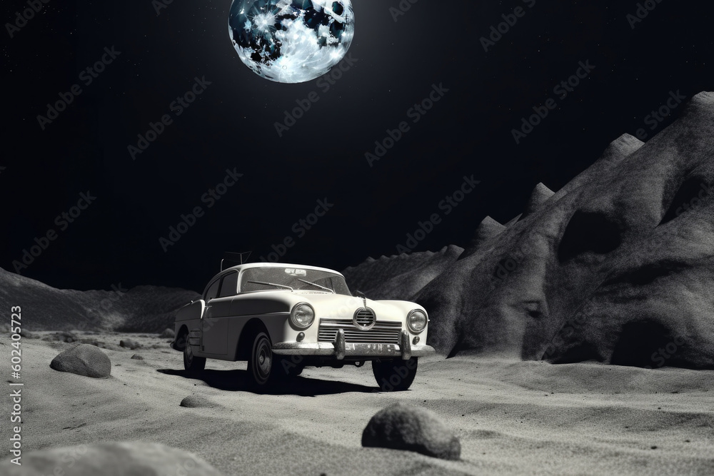 The watermark will not be included on Sticker.: Futuristic retro car on surface of unknown planet with galaxy and nebula background - vehicle in spac