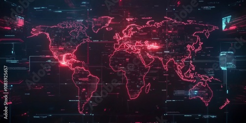 The watermark will not be included on Sticker.: Futuristic world map with holographic effects and interconnected nodes,space for text