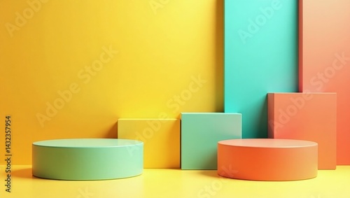 The watermark will not be included on Sticker.: Geometric composition of colorful elements with podiums for product presentation